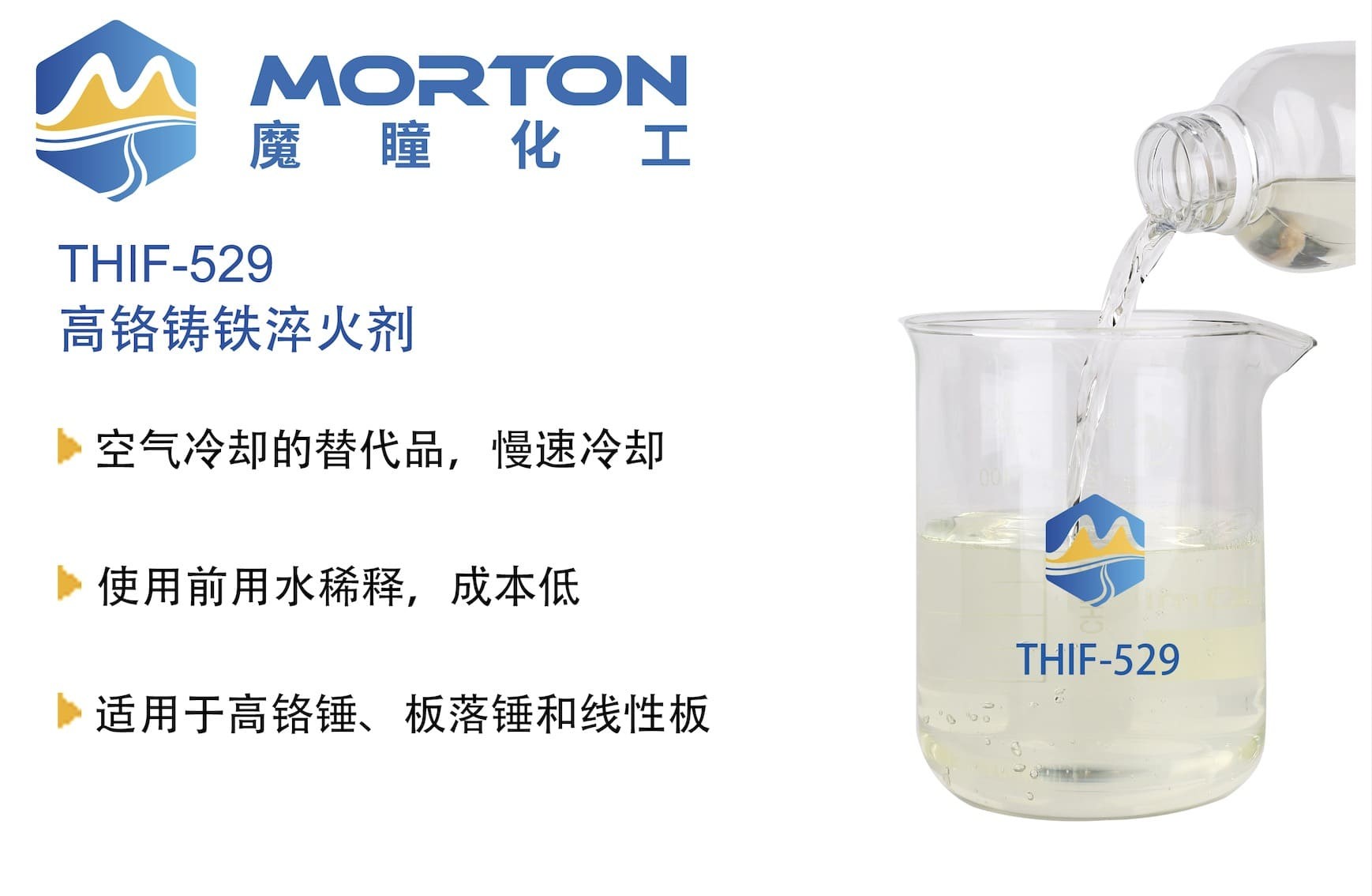 高铬铸铁淬火剂为水溶液,可与水多倍稀释使用,具有防锈、杀菌、防腐的功能,不易燃,无火灾危险,对操作人员和环境无害,不易老化,使用寿命长。