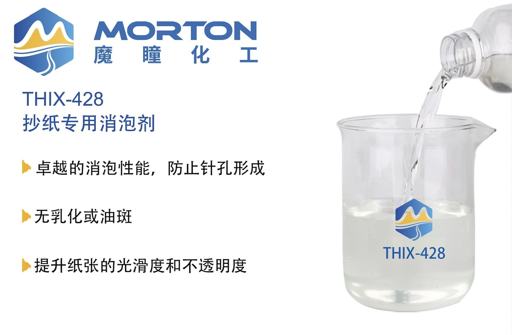 ①具有优良的消泡性,消除气泡对工艺的影响,避免孔洞的形成,减少断纸,不会使储浆池溢流。
