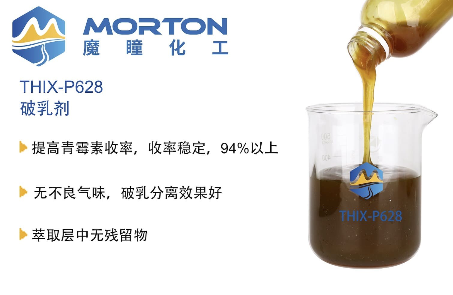 破乳剂可以排除电偶层的干扰,迅速接近乳化界面,使两相界面更容易分离,从而对发酵液破乳能力大大提高,破乳效果好,用量少,只需100ppm左右。不仅破乳分离效果好,而且还能提高青霉素收率,收率可稳定,在94%以上,并且除杂率好,杂质和色素带进少,在萃取层的酯相中没有本破乳剂的残留物,有利于提高青霉素成品质量,节约青霉素生产成本,且无不良气味,很受药厂工人欢迎。